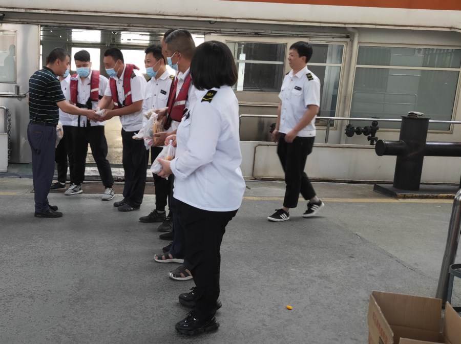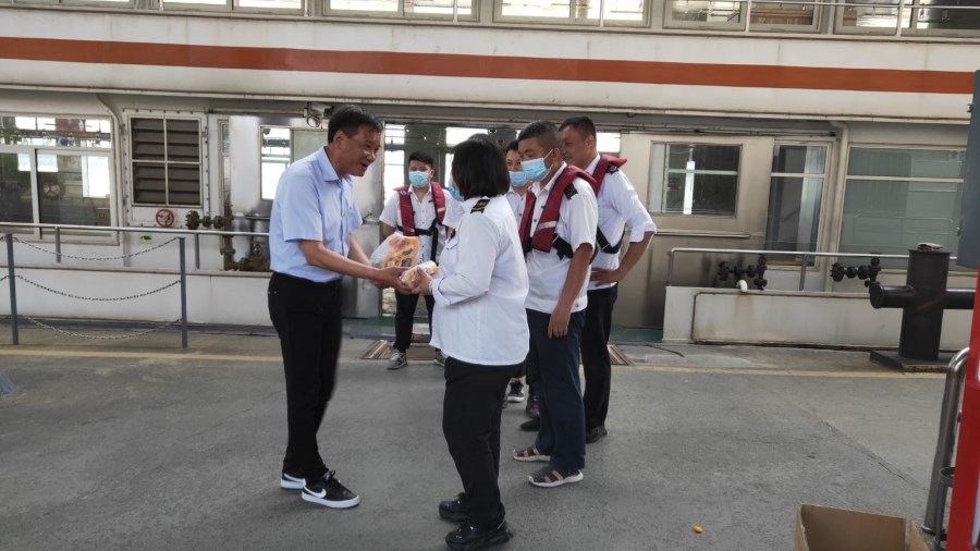 6月14日上午,轮渡时博网页版党委书记、总经理张勇和纪委书记、工会主席陈宝云来到宁浦航线为在岗职工发放提前购置的粽子、鸭蛋等端午节传统食品。
