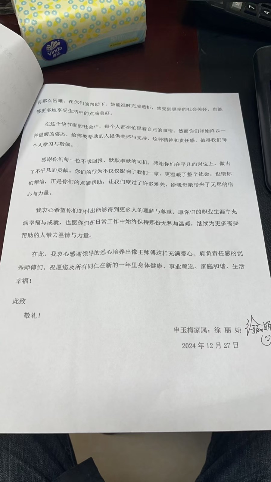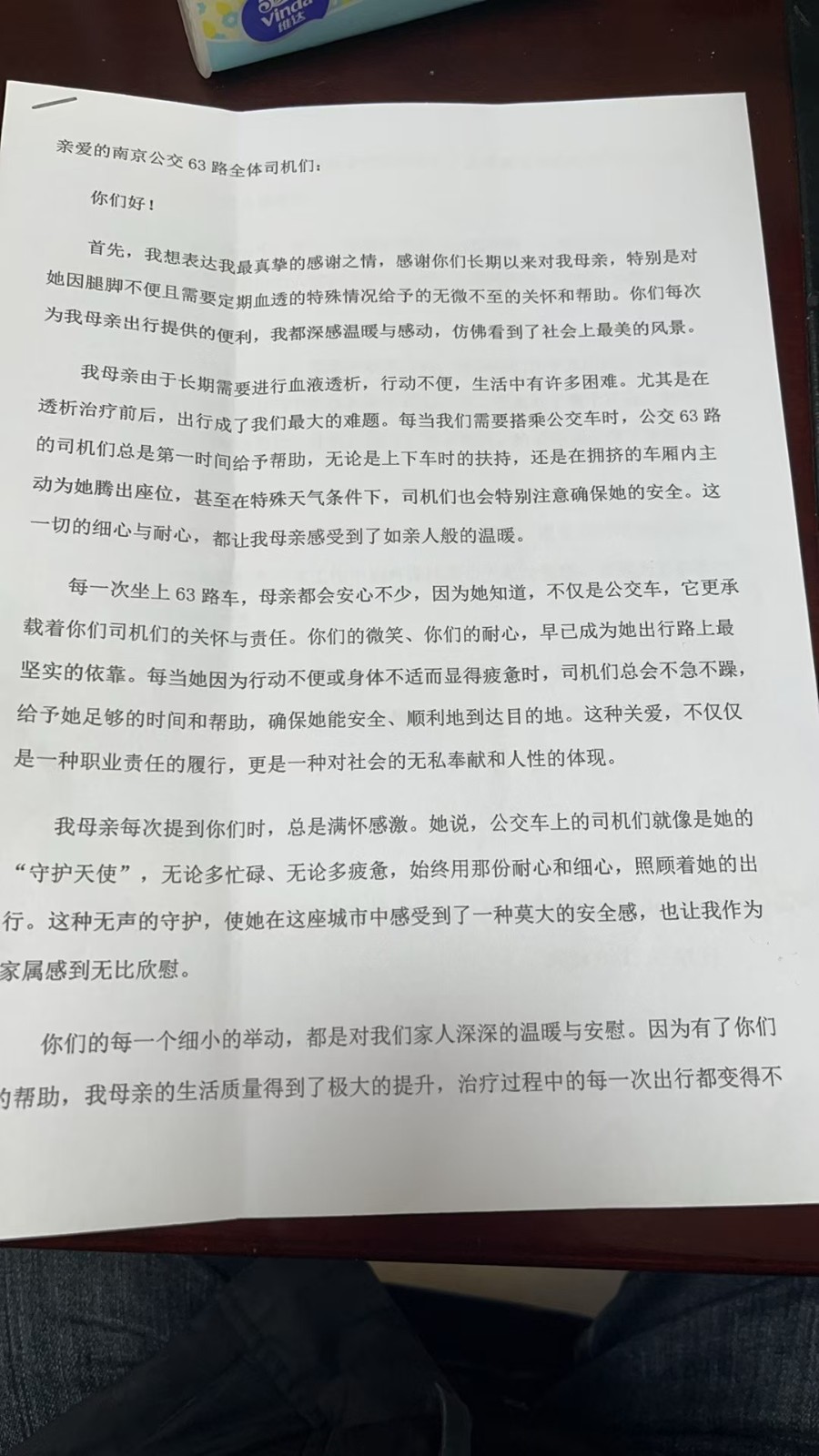 据了解,老人名叫申玉梅,由于不会写字便请女儿徐丽娟帮忙写了一封感谢信并制作了锦旗,以此表达对长期以来因母亲申玉梅腿脚不便且需要定期血透的特殊情况,63路全体驾驶员给予了无微不至的关怀和帮助的感激之情,“你们每次为我母亲出行提供的便利,我都深感温暖与感动,仿佛看到了社会上最美的风景。”信中如此称赞道。