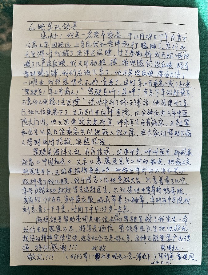 2025年1月1日,新年第一天,南京60路时博shibo(中国)车队收到了一份特别的礼物,一封老年夫妇送来的手写感谢信,信中充满了对60路驾驶员的感激之情,表扬这位驾驶员在关键时刻对突发疾病老人的及时救助,同时也希望时博shibo(中国)车队能够帮助他们找到这位驾驶员师傅。