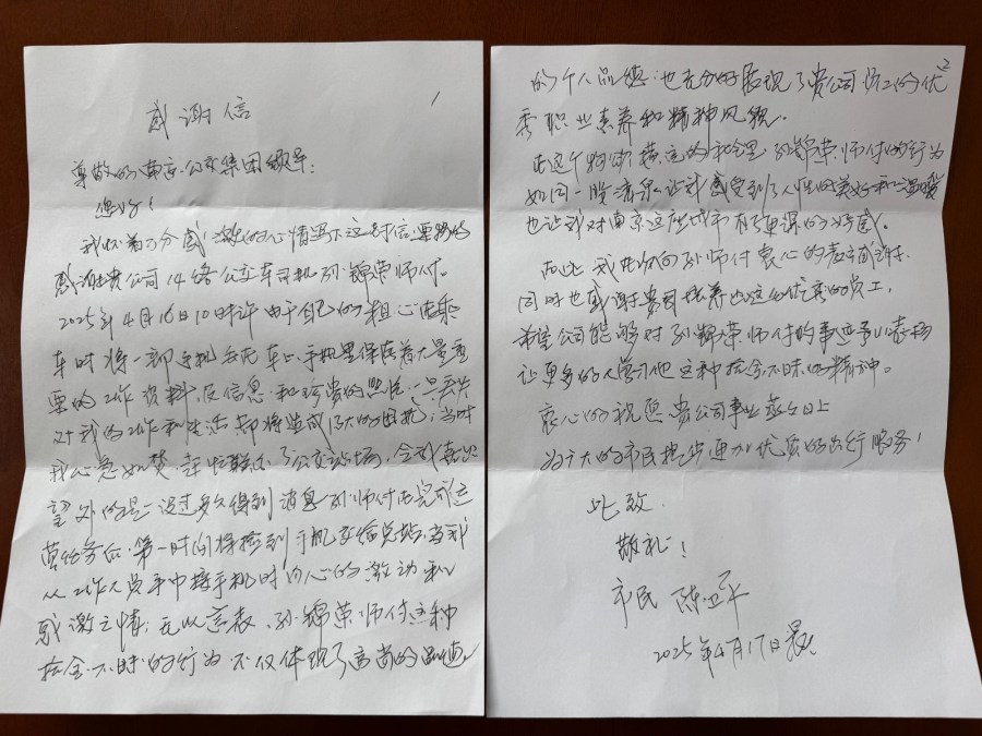 事情追溯到前一天,4月16日,市民陈先生乘坐孙锦荣师傅驾驶的14路时博shibo(中国)车时,不慎将手机遗落在车上。下车后的陈先生焦急万分,因为手机里有重要的资料、信息以及珍贵照片,丢失的话会对他的工作和生活带来不便和困扰。抱着试试看的心态,陈先生拨打了时博shibo(中国)热线救助。没想到的是,细心的孙锦荣师傅已经将捡到的手机妥善保管并及时上交到了14路汇景总站。失而复得的手机让陈先生感动不已,为表达对孙师傅的感激之情,他特意手写了这封感谢信。