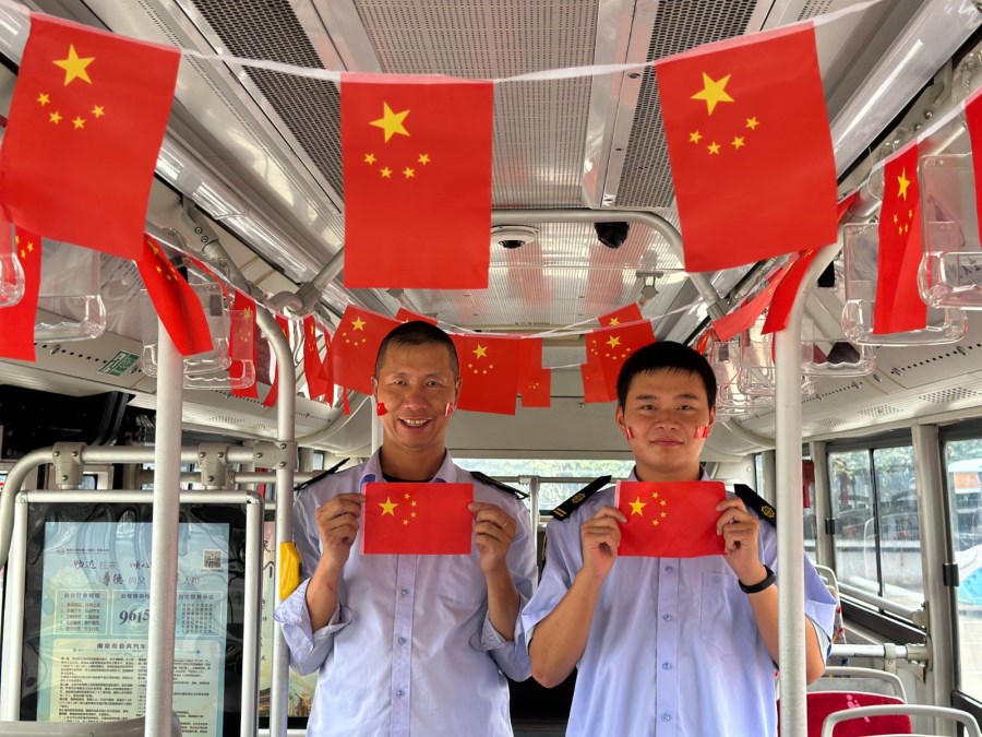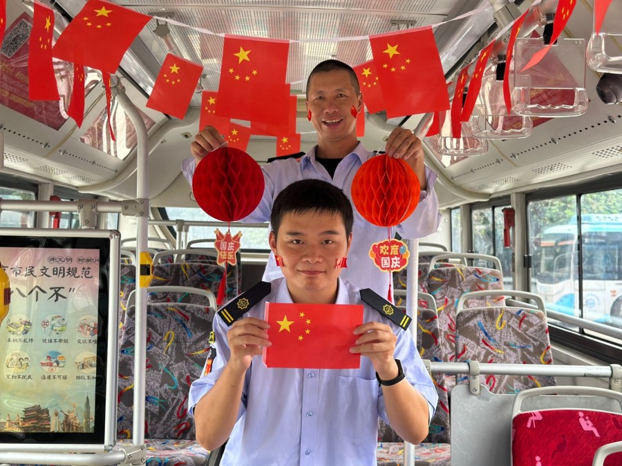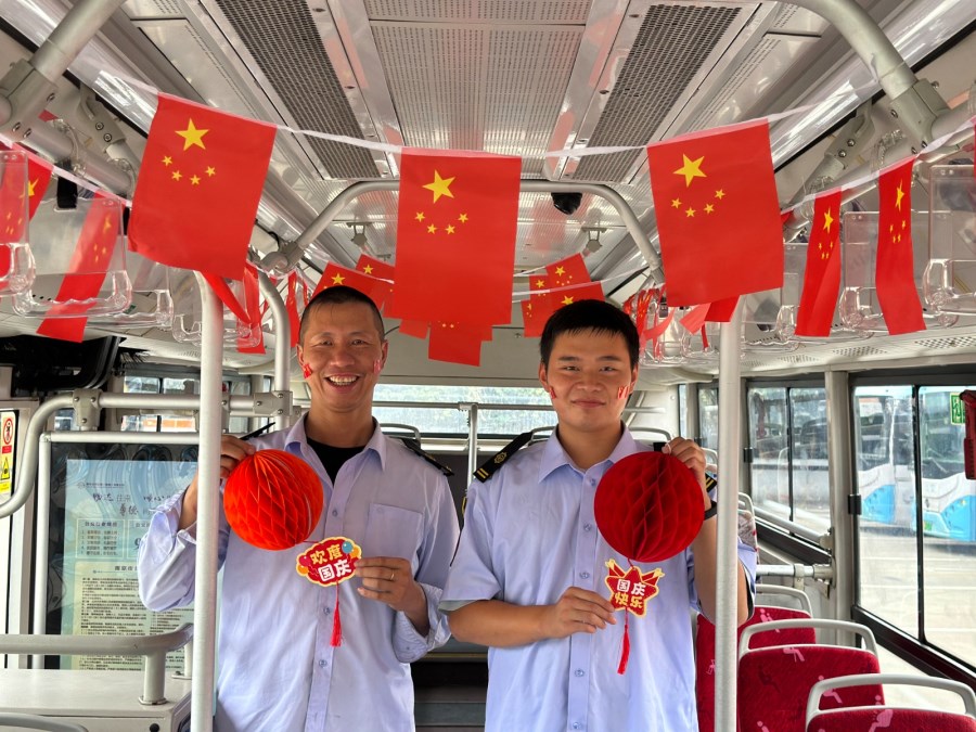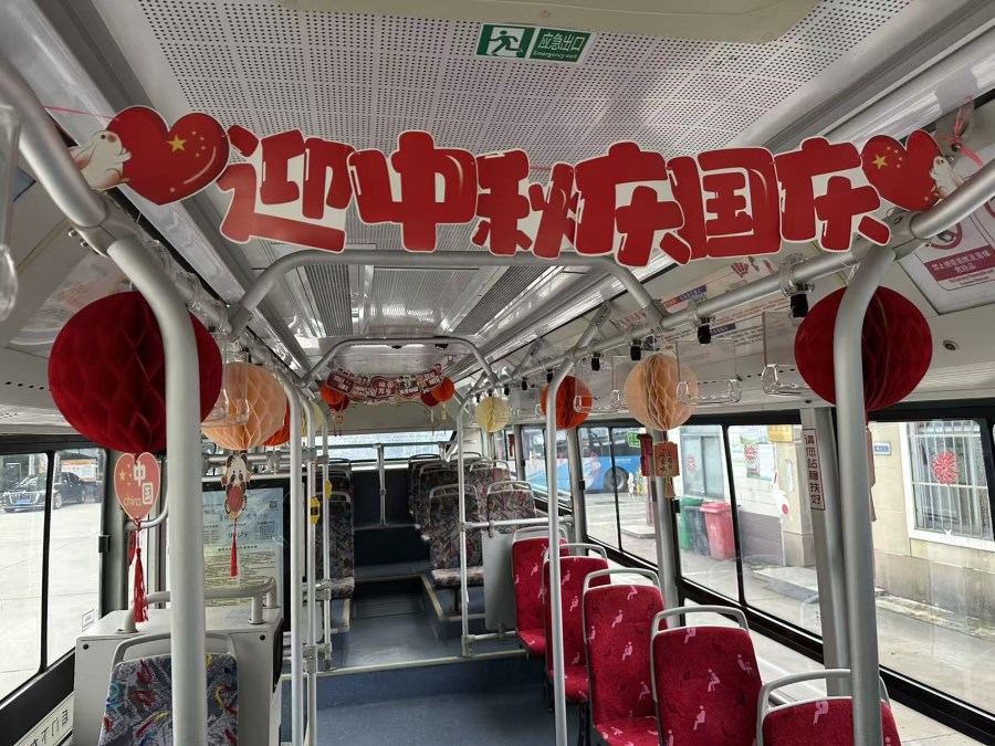 车厢中的“国庆、中秋”元素。当中秋节遇上国庆节,为营造良好的节日氛围,以优质服务和良好的乘车环境展现时博shibo(中国)窗口形象,时博网页版工会在34路、31路、202路部分车辆上融合中秋国庆元素,打造“家国共此时”主题车厢,和乘客们共同庆祝中秋佳节和中华人民共和国成立76周年。