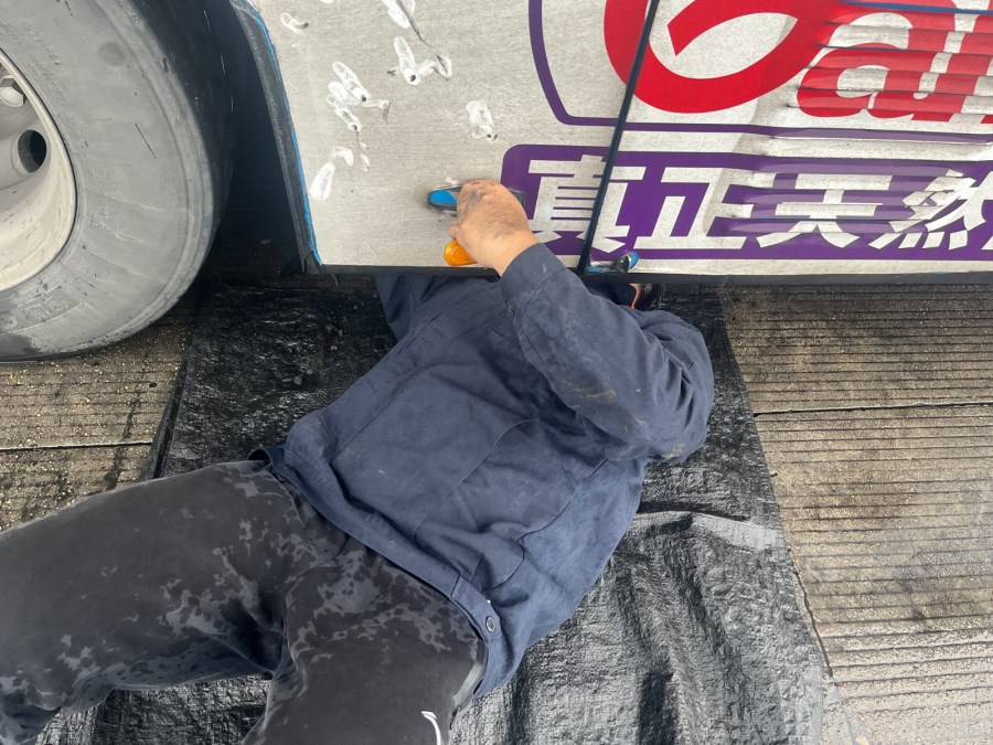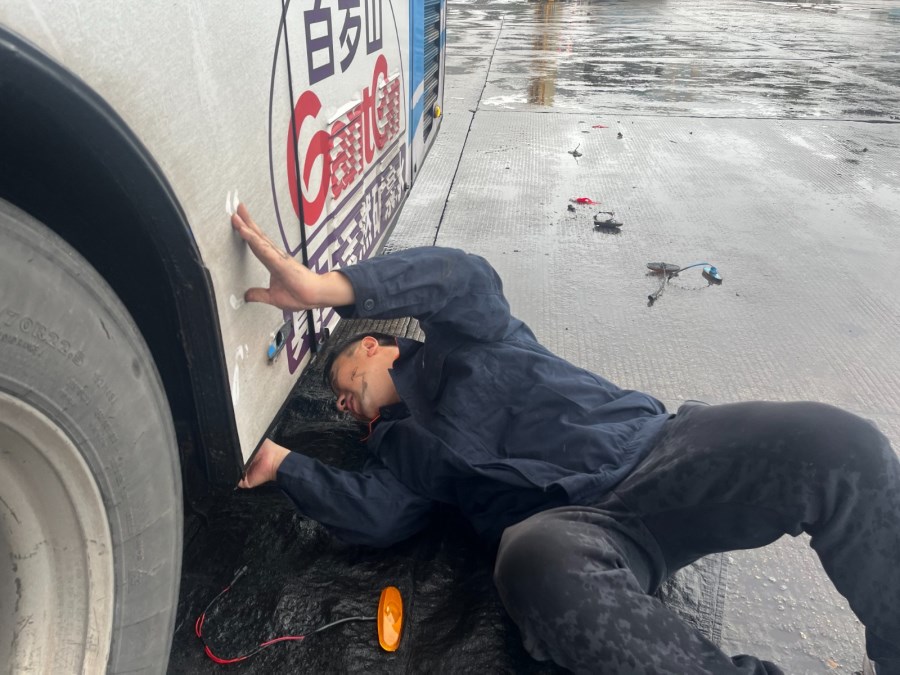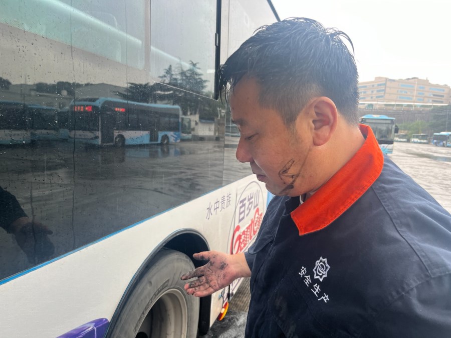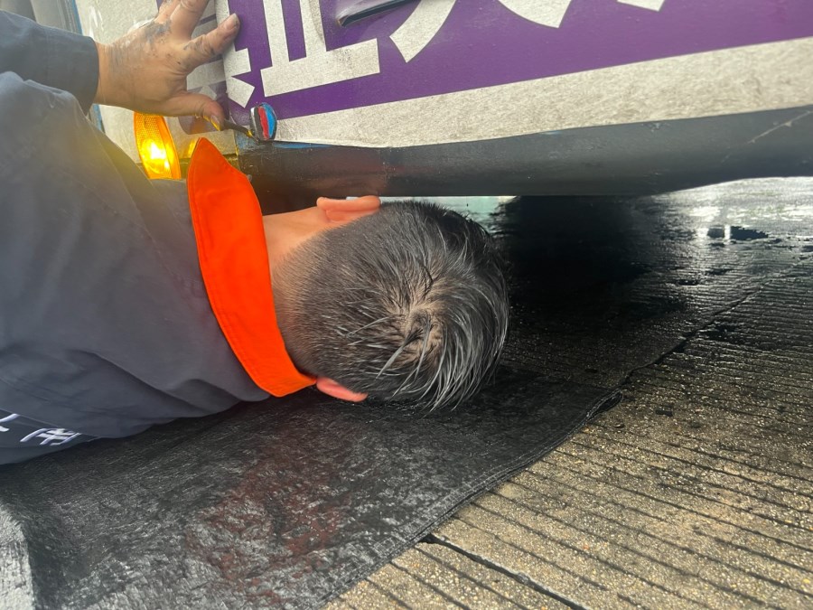 机电工陈锐,没有丝毫犹豫,他提起工具,一头扎进了滂沱大雨中。为了不耽误驾驶员后续的年检和运营时间,他争分夺秒。场地积水严重,他顺手找来一块黑色塑料袋垫在湿漉漉的地上,随即俯身,半个身子毅然探入了车底。