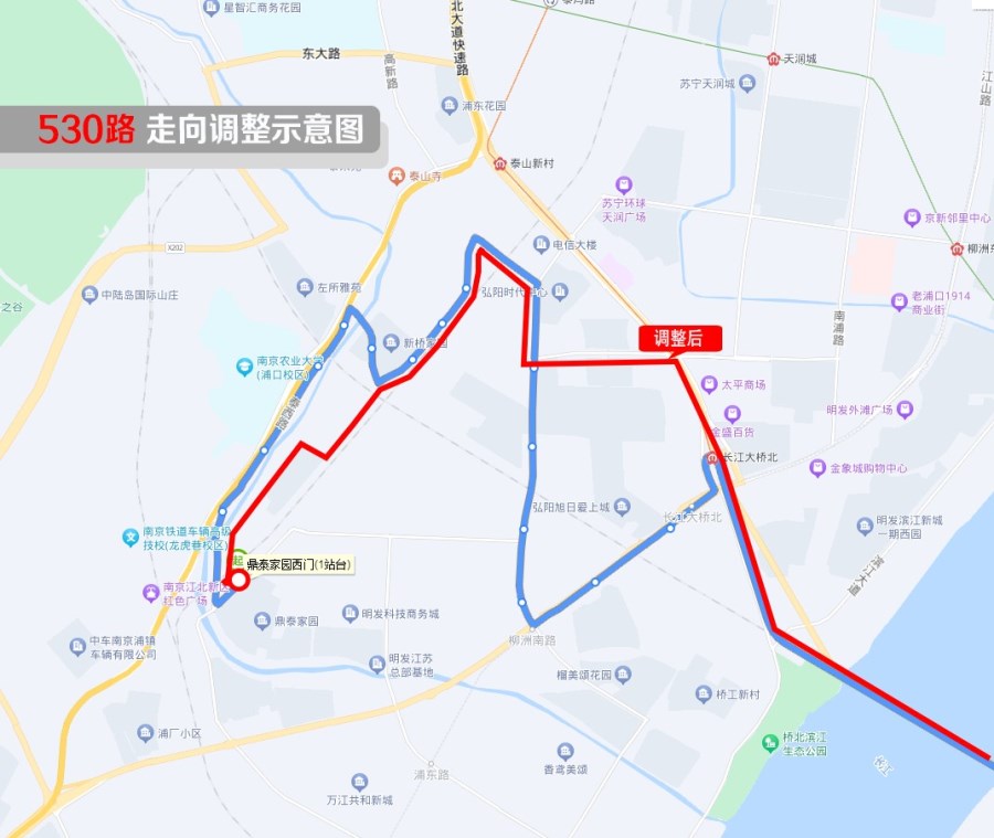 * 线路走向变化:自“鼎泰家园西门”站起,拟沿凯天路、浦环西路、盛浦路、弘泰西路、弘泰路、高新南路、柳州北路、泰达路、大桥北路、长江大桥回原线行驶(返程路段相同),其它路段不变。
