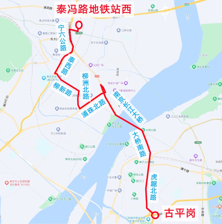 * 具体走向:天华西路、宁六公路、泰西路、柳新路、柳洲北路、浦珠北路、大桥北路、南京长江大桥、大桥南路、虎踞北路至终点站“古平岗”运行(返程路段相同)。