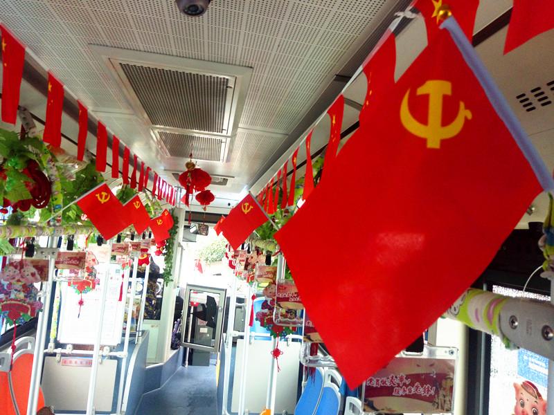 7月1日,扬子时博shibo(中国)一辆503路时博shibo(中国)车驶出总站,乘客看到车厢内挂满了庄重的党旗和国旗,部分党员身份的乘客直呼:太振奋人心了。