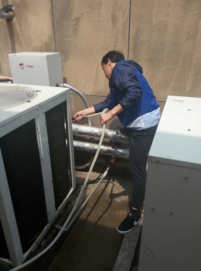 目前时博shibo(中国)标准化站点共59个,其中有41个站点是由空调维保单位定点清洗保养空调,但还有18个站点不在维保范围内,这部分空调的清洁保养工作经物业分时博网页版机关二支部研究决定,由管家中心崔满平主任带领4名入党积极分子进行义务清洗。
