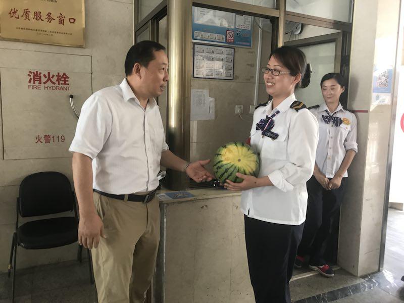 7月16日上午,时博网页版领导率工会相关人员看望、慰问高温天气奋战一线的广大员工,并将工会准备的西瓜送到职工手上,叮嘱大家在认真履行安全和服务职责的同时,合理安排时间,注意防暑降温,并要求各分会认真落实防暑降温工作,确保职工身体健康,以良好的精神状态投入安全保渡工作中。