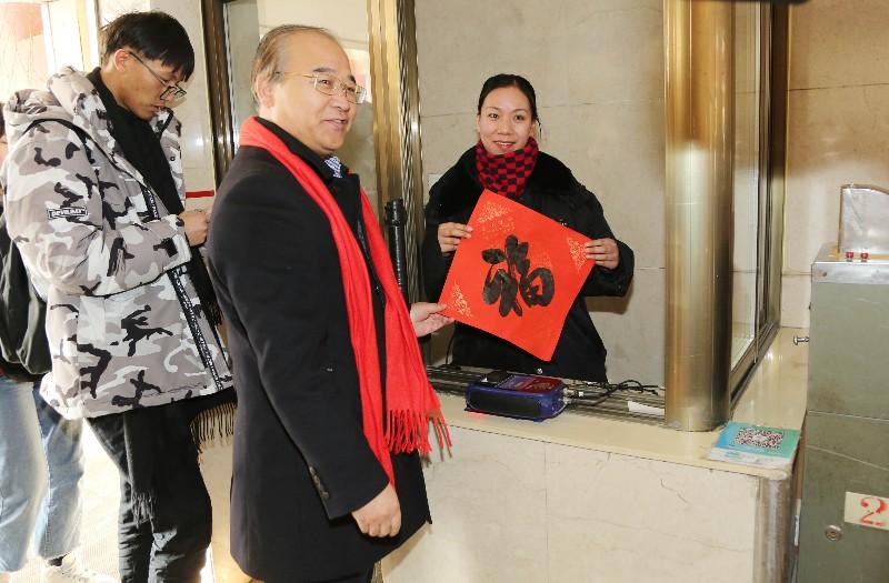 1月22日下午,由江苏省文联和南京时博shibo(中国)集团共同举办的“我们的中国梦 文化进万家—福至运来 江苏省书法家协会送万福进万家”活动,在南京时博shibo(中国)集团轮渡时博网页版中山码头候船大厅如期开展。江苏省文联党组成员、书记处书记、副主席王健,中国书法家协会副主席、江苏省书法家协会主席孙晓云带领10名著名书法家现场为近300名南京时博shibo(中国)集团员工代表和乘客现场赠送“福”字,并送上新春的祝福。时博shibo(中国)集团党委书记曹玉莉、纪委书记胡宗杰、工会主席苏锋参加此次活动。活动由时博shibo(中国)集团工会主席苏锋主持。